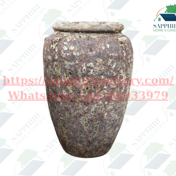 The Antique Mossy Rustic Jar showcases a weathered, textured surface with earthy brown tones accented by natural green and white speckles, evoking the charm of aged pottery touched by time and nature. Its handcrafted look and classic jar silhouette make it a perfect statement piece for gardens, patios, or rustic-style interiors.