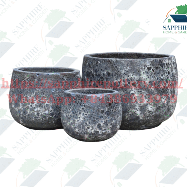 This unique ceramic pot set in Black Atlantis features a bold volcanic lava texture with deep charcoal and ash-white tones. The porous, crater-like surface adds a raw, natural charm, perfect for creating a dramatic focal point in both indoor and outdoor garden settings.