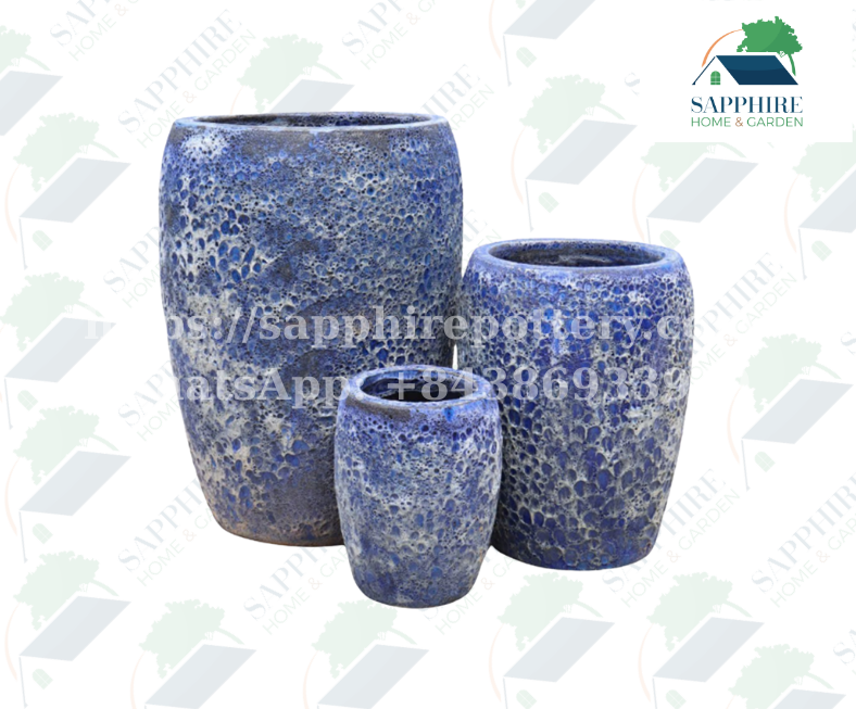 This set of 3 ceramic planters showcases the striking Blue Atlantis glaze, featuring a unique crater-like texture reminiscent of natural coral stone. The vibrant deep blue tones blend with subtle white accents, creating a captivating ocean-inspired look. Durable and weather-resistant, these planters are perfect for adding a bold statement to gardens, patios, or indoor plant displays.
